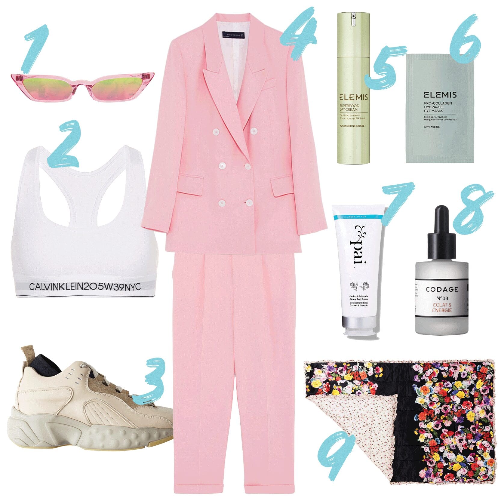 Spring! Spring, when everyone and thing starts to come alive again and I stop hiding under layers of black! Well… almost. April in UK usually still calls for a few layers, but I’m definitely ready to start adding some colour to my repertoire. I love this suit combo from Zara. Pastel pink with a 90s vibe, it’ll look on-point worn with beige Acne Manhattan sneakers and these super punchy socks. Add a classic Calvin Klein bralette for comfort and finish with pink Poppy Lissiman ‘Le Skinny’ glasses, and I’ll feel ready for anything that might come at me – whether I’m on a shoot, answering emails in the office or visiting designers.