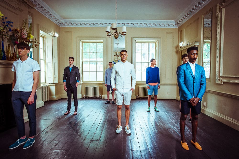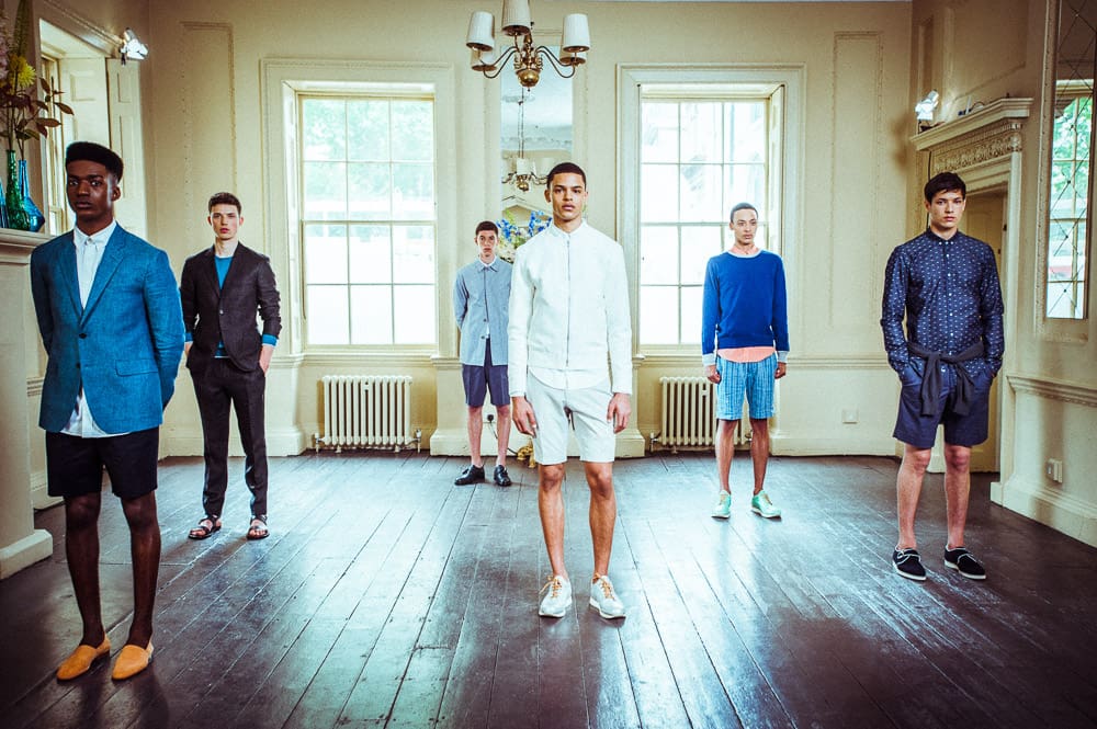 Mr Start, founded by Philip Start, has made a name for himself in contemporary tailoring, and his seamless blending of men’s casual wear with smartly tailored pieces was evident in the presentation. Neatly cut shorts were key to the spring looks, teamed with crisp button down white shirts and statement jackets, from a neat white sports jacket to a structured blue blazer. Mr Start’s outifts were finished with Mr Hare’s admirable contribution; suede espadrilles, silver trainers and classic loafers implied the variation implicit in Mr Start’s range. The next room demonstrated the pair’s aptitude for smart options, too, with variations on the checked cotton shirt displayed alongside stunning black tuxedoes, both classic and with fur-lined lapels, and a selection of high shined classic black lace ups.